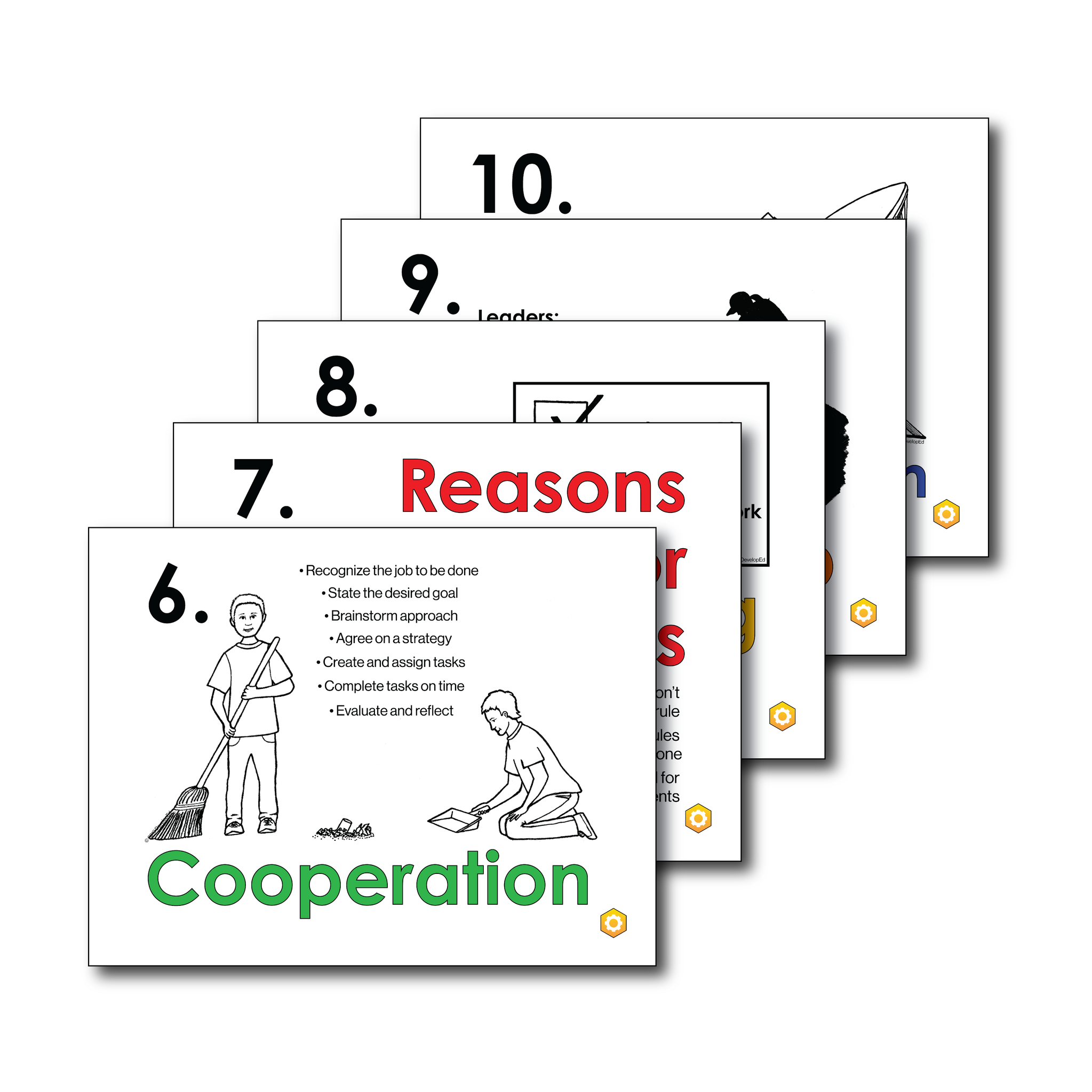 Colorful set of 15 Essential Skills posters (plus title poster) illustrating each of the 15 skills with descriptive detail and developmental icon - an excellent visual reminder designed to presence self-discipline. Printed on high-quality card stock. 8.5 x 11 inches